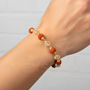 The natural beauty and spiritual significance of Rudraksha beads are thoughtfully enhanced by a delicate gold-plated edge, creating a bracelet that seamlessly blends sacred tradition with contemporary sophistication. This refined design adds a subtle glow and elevates the bracelet from a spiritual talisman to a statement piece, perfect for any occasion.